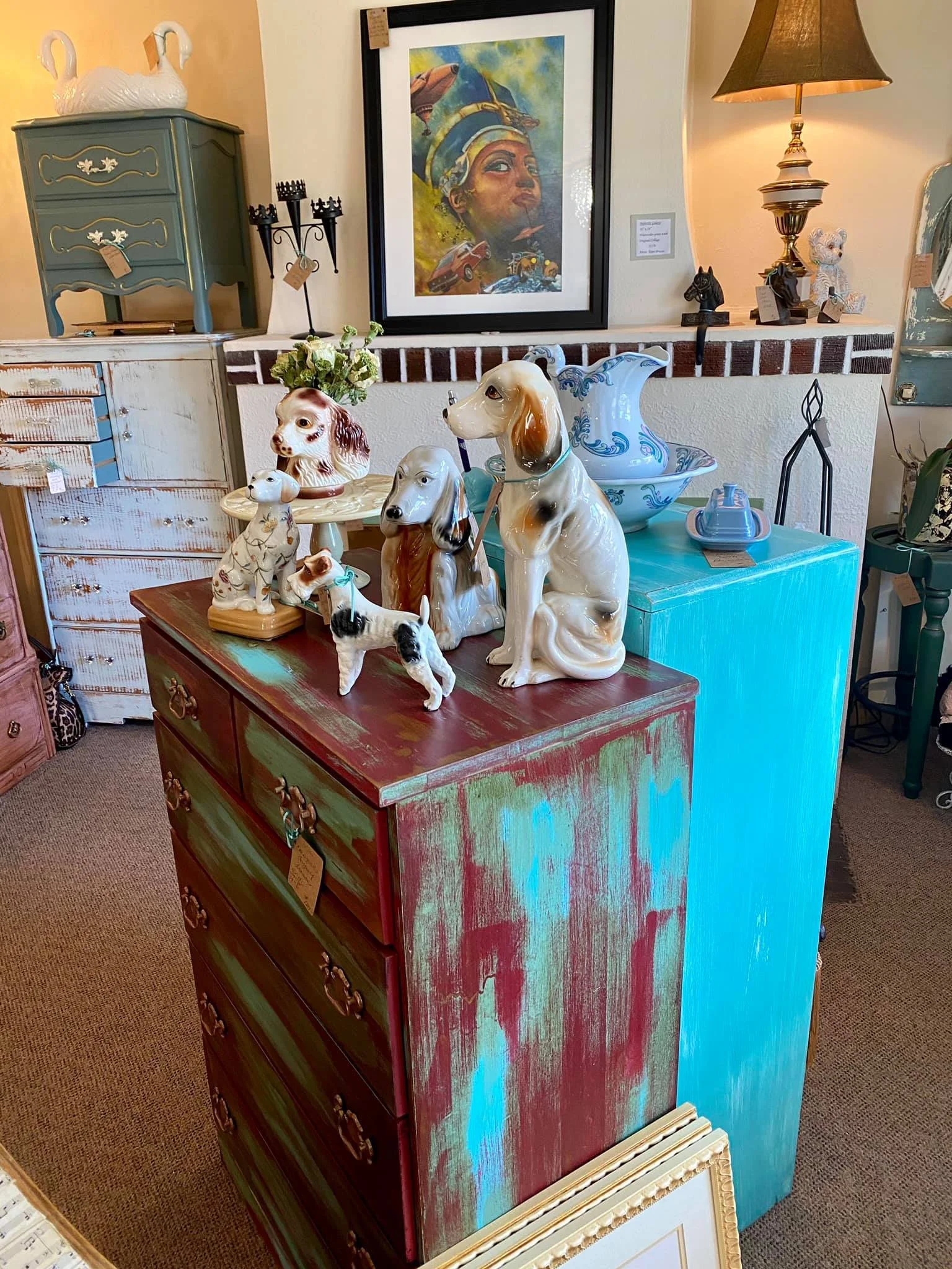 Refurbished furniture, vintage goods, antique jewelry and collectable tableware. The candles and cards are perfect for gifting. Sassy signs and tea towels are sure to bring a smile.